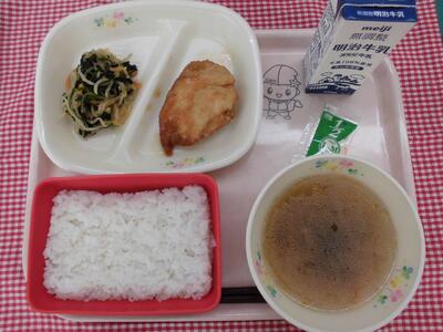 今日の献立は、「ごはん チキン南蛮 中華風もやしあえ 茎わかめスープ 牛乳」でした。