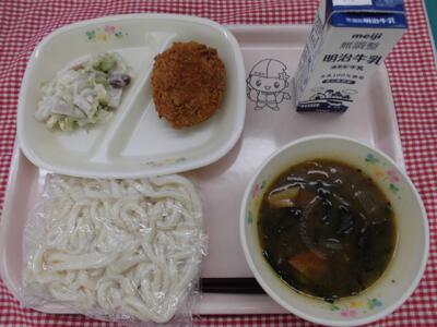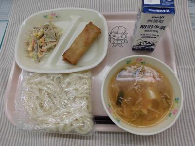 今日の献立は、「みそキムチうどん 春巻 ごぼうとコーンのサラダ 牛乳」でした。