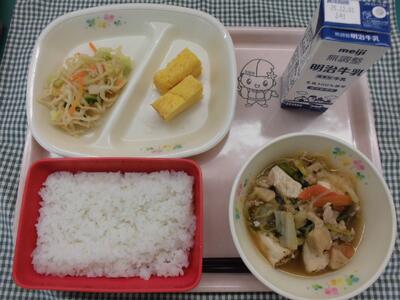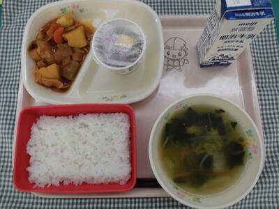 今日の献立は、「ごはん 納豆 インド煮 鶏団子スープ 牛乳」でした。