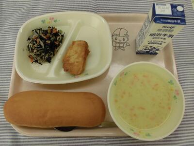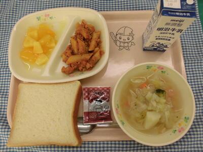今日の献立は、「コッペパン タンドリーチキン ひじきとツナのサラダ 豆のポタージュ 牛乳」でした。