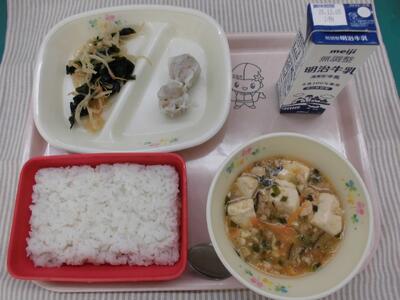 今日ん献立は、「麻婆丼 肉シューマイ もやしとわかめのナムル 牛乳」でした。