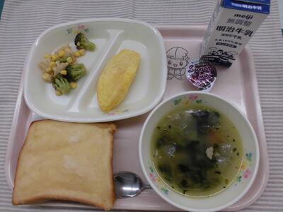 今日の献立は、「メープルトースト トマトミートオムレツ 花野菜サラダ コンソメスープ 牛乳」でした。
