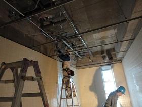 トイレ改修工事の現在の状況は、先週末までの大型連休を使って大きな騒音を発する土間解体工事が終了し、同時にブース解体工事や便器の撤去も進められているところです。また、新設の配管工事も天井部分を開けて行われています。