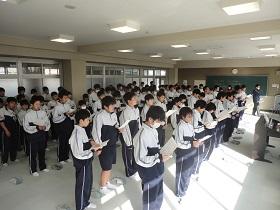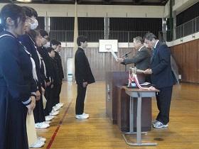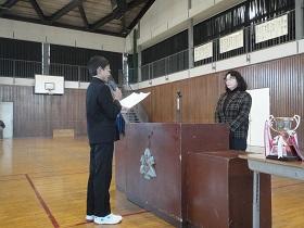 続いて、校内書初展の表彰と各種大会・コンクールでの入賞者の賞状の伝達を行いました。入賞者の皆さんおめでとうございました。詳細については、後日、“学校だより”で紹介したいと思います。