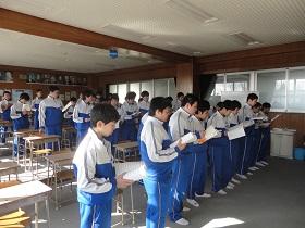 3月8日の「卒業式」に向け、卒業記念合唱“大地讃頌”の練習が行われています。現在は、音楽の授業での練習を中心に、昼休みにはパートごとの練習も行われています。混声四部の合唱曲で、1年男子がテノール、2年男子がバス、1年女子がソプラノ、2年女子がアルト、3年生は4つのパートに分かれています。それぞれのパートの音取りも順調に進んでいます。