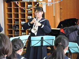 発表では、部員一人一人が、担当している楽器での独奏曲や重奏曲を披露してくれました。体調を崩してしまい、全員が参加できなかったことは残念でしたが、OBが急遽演奏してくれたり、最終演奏では、部員全員で「春メドレー」を披露してくれたりと、終始和やかな雰囲気で心温まるコンサートでした。会場は、大きな拍手で盛り上がりをみせ、2017年を締めくくる部活動となりました。