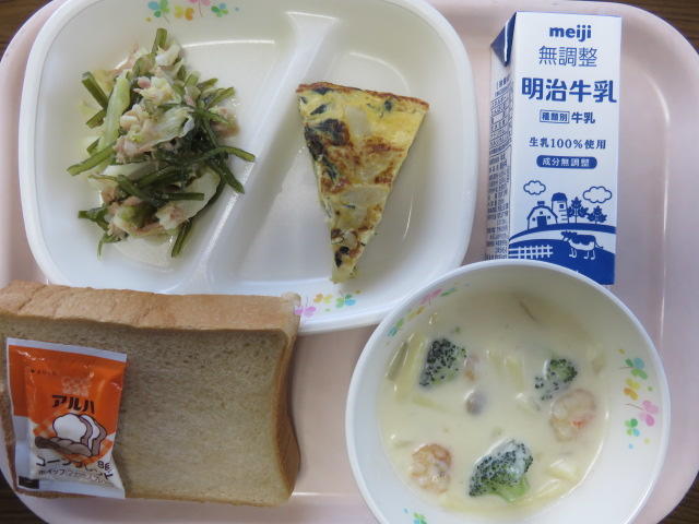 <食育コーナー「今日の献立」>黒食パン(厚切り)、マーガリン、牛乳、スペイン風オムレツ、茎わかめサラダ、マカロニクリーム煮でした。 「オムレツ」を久しぶりにいただきました。なかなか我が家には、「オムレツ」が食卓にのぼりません。