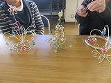 PTA教養部主催事業「ワイヤー・クラフト講習会」>昨日の19日、13時30分か、研修室で「ワイヤー・クラフト講習会」がありました。保護者12名+数名の生徒の参加もありました。私は、生徒会福祉委員会(吹奏楽部と合唱部も参加)主催の「八汐苑訪問」があった関係で、参加することはできませんでしたが、出来上がった頃に見せていただきましたが、色や太さの違うワイヤーを使い、クリスマスにちなんだビー玉を使った綺麗な置物が出来上がっていました。