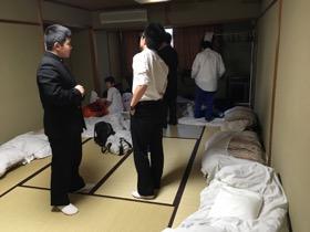 22:00 ロビーで室長会議中。担当より、今日一日の振り返りと諸注意が。明日も起床時間は早いのでしっかり休みましょう。