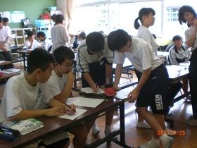 1単位時間のみの授業での本時の活動では、前時の学習のつながりを大切にするとともに、生徒が興味・関心を高める様な教材の提示や電子黒板の活用を図るなど、学習活動にも工夫を凝らしながらの授業展開でした。個人の思考を大切にしながら、少人数指導の特性を生かした周囲の生徒との“学び合い”の活動を取り入れながら、対話的な学びを学習活動に取り入れ、机間指導でもきめ細かな個別指導を行いながら授業が行われました。