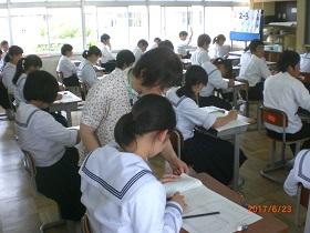 テスト中には、テスト問題作成担当者が各教室を巡回し、受験状況の確認を兼ねて質問等に対応します。生徒たちは緊張しつつもがんばって受けていました。今日で、中間テストが終わりましたが、生徒たちは最後までがんばって受けていました。