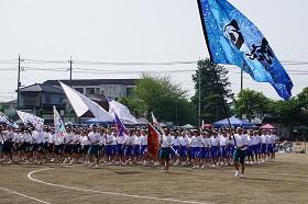 入場行進では、梅雨の合間の青空の下、指揮者の笛と旗の合図で入場行進が始まりました。生徒会長古市君が持つ「校旗」を先頭に、生徒会役員や体育委員長・副委員長が国旗・矢板市旗・矢中応援旗に先導され、各団の大応援旗と各学級の応援旗をなびかせながら行進曲に合わせて元気よく入場行進を行いました。