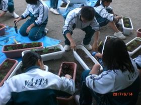 体育委員会は、先日の運動会の際に使ったまり入れ用の“まり”の乾燥後の片付けを行いました。また、緑化委員会では、先日のグリーンボランティアに続いて、夏から秋に向けて、種から育てた「マリーゴールド」や「サルビア」の苗を花壇やプランターに植えつけました。学芸委員会では本日実施した“計算コンクール”の採点作業を行ったり、図書委員会が読書1万ページの集計作業を行ったりするなど、その他の委員会も積極的に日常の活動に取り組む姿が見られました。