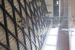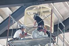 写真3,4枚目・・・朝から、体育館内の照明で、「球換え」しても点灯しないものについて、安定器等の交換工事がありました。すみやかに足場を組み、工事を始めてくれました。照明が、午後にはすべての照明が点灯しました。加えて,南壁面の「四角い時計」も修理してくださいました。