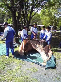 宿泊したテントのたたみ方の講習をいけ、友達と協力、話し合いながらテントの片付けが完了しました。その後、自由時間があり、落ち葉にうずもれて遊んでいる生徒もいました。