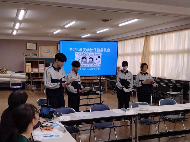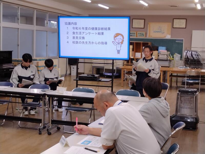 今回は、学校医の上田先生、学校薬剤師の大貫先生をお招きし、保健委員会の生徒が本校の現状について発表し、