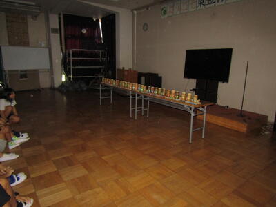 体育館でキャンドルを囲んでキャンプファイアーの代わりとしました。