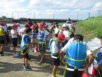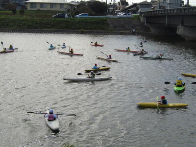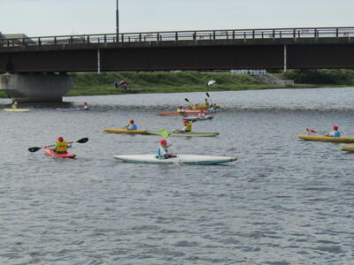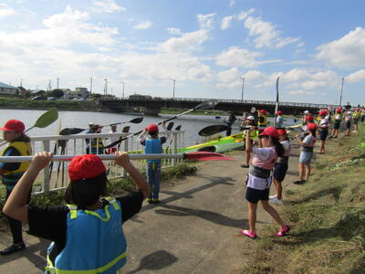 やや風が強く、風に押し流されてカヌーの操作に苦戦する児童が多数いました。