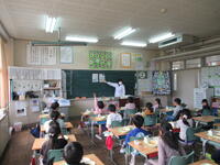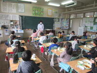 1年生の学級で給食を一緒に食べた後、牛乳の栄養成分であるカルシウムの働きについて話をしてくださいました。