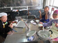 白米は、ガスを使い鍋で炊きました。火加減に注意しながら行っていましたが、おこげの班もありました。ガスで米を炊く経験は、災害などで電気が使えないときにも役立ちます。