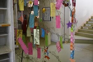 七夕祭り 投稿日時 : 2023/07/07 管理者 昇降口に七夕飾りが登場しました。6年生は、外国語の学習として英語で短冊を書きました。願い事は、自分の欲しいものを書いた短冊と様々でした。それぞれの願いが天に届くことを願います。