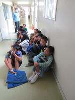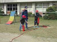 校庭への避難の後、横芝光消防署の協力を得て、消防車見学(1・2年生)、煙体験(3~6年生)、消火器体験(5・6年生)を行いました。