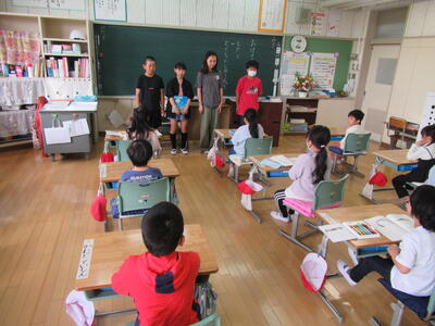 朝の準備と本の読み聞かせに6年生が来てくれています。