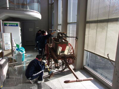 今日は、ロビーに展示している大型資料の清掃もしてもらいました。