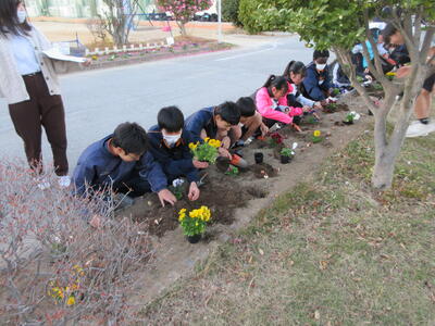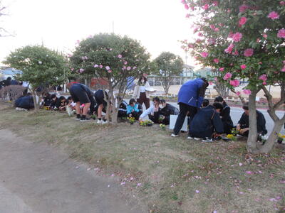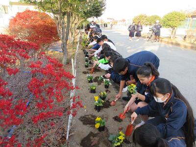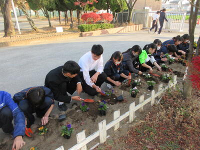 12/3(水)と12/4(木)に、生徒会が主体となって、花植えボランティアを行いました。パンジーとチューリップの球根を花壇に植えました。