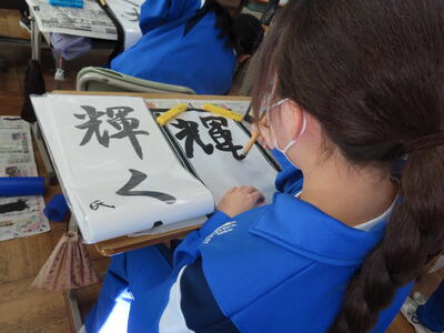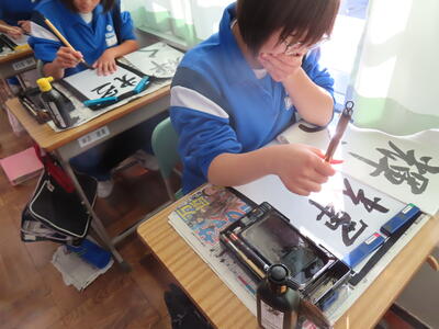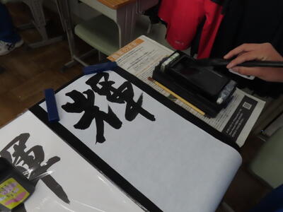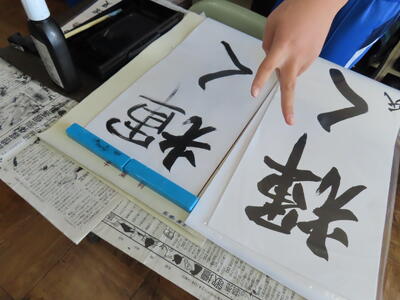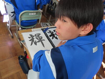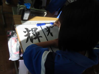 1年生の国語、書き初めです。使い慣れない筆と少しだけ崩れた行書に四苦八苦です。