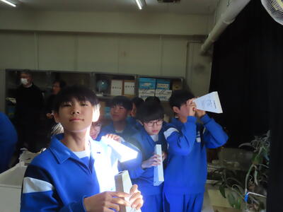 寒い一日でした。冷たく強い風が吹き、校庭の際に立つケヤキの木の葉も大方落ちてしまいました。落ちた葉が風にあおられ、校舎に入り教頭先生が慌てて掃除をする姿がありました。また、HP担当者の部屋から見える駐輪場の自転車が倒れてしまいました。掃除中に3年生が自転車を立て直す微笑ましい姿も見られました。良い光景でした。1年生は東京理科大学教授 岡田先生とサポートの学生さん3名を講師に迎え、ワクワク理科授業を受けました。学校では経験できないような光の実験に驚嘆の声を上げ、楽しそうでした。明日は土曜授業になります。保護者の皆さん、よろしくお願いいたします。
