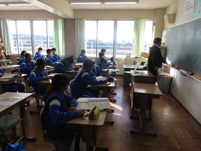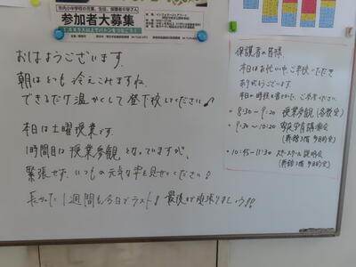 登校指導をする7時30分から8時15分くらいまではとても寒く、真冬を感じましたが、その後気温は上昇し穏やかな一日になりました。日差しの入る窓際は暑いくらいで、HP担当者の部屋、教室の窓際ではTシャツでも過ごしても全く問題なし、でした。それでは本日の校内の様子を当日にお伝えします。
