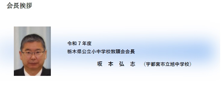 この度,令和7年度栃木県公立小中学校教頭会の会長という重責を担うことになりました。微力ではございますが,前会長や本年度役員,事務局,そして関係諸機関と手を携え,本県の教育発展のため全力を尽くす所存です。一年間,どうぞよろしくお願い申し上げます。